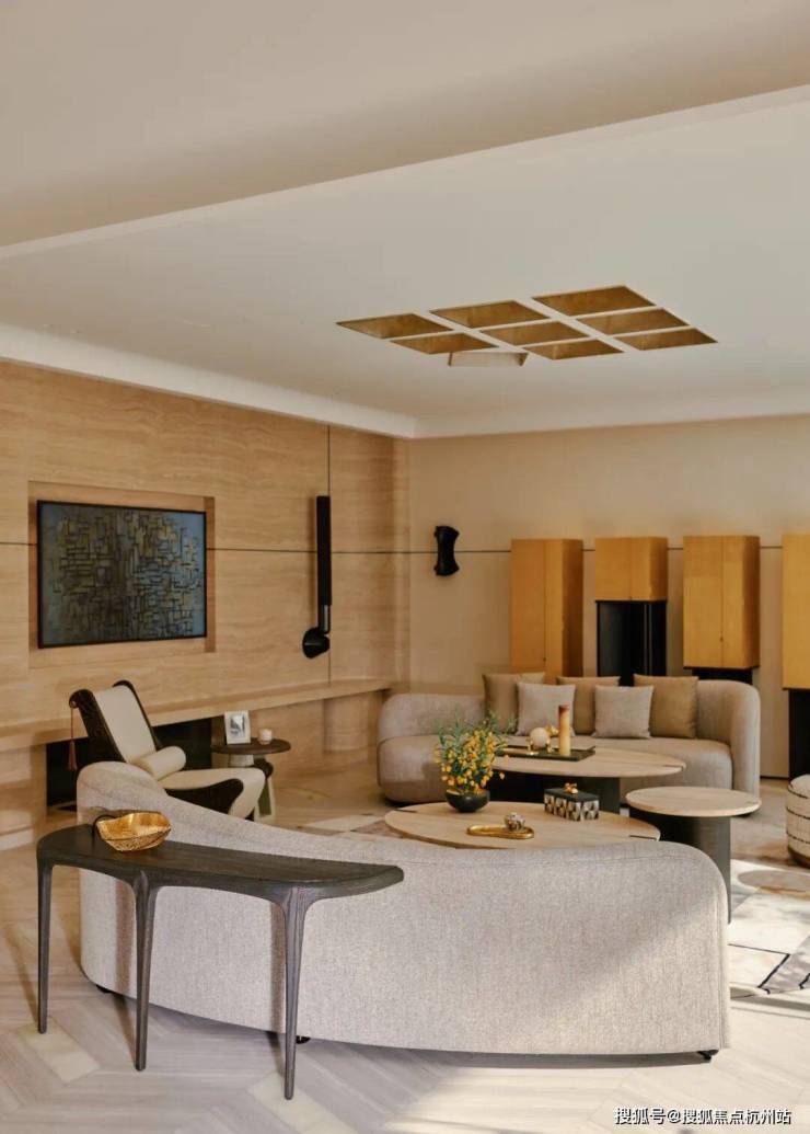 顺着弧形木质楼梯抵达地下空间,仿佛游走在一曲流动的乐章中。一切都共同呼应着水的特质,传递着低调隐逸情怀与圆融个性。