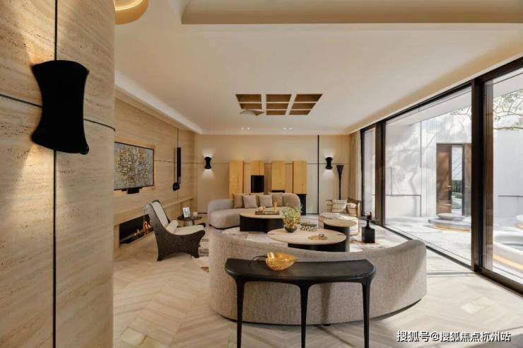 这一层更聚焦于私谈、影音、娱乐、品酒、饮茶,深沉又静谧。近6米高的垂直挑空玻璃壁炉矗立于眼前,如同一件令人赞叹不已的大型雕塑装置,它弱化了空间中的大理石承重柱,将其纳入共同构成一个完整的全新的装置,集功能性与艺术性于一身。