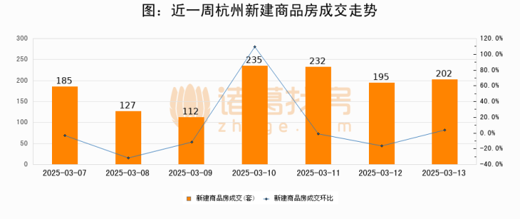根据杭州市住房保障和房产管理局数据显示,2025年03月13日杭州新建商品房成交202套,较昨日增加7套,环比上涨3.6%
