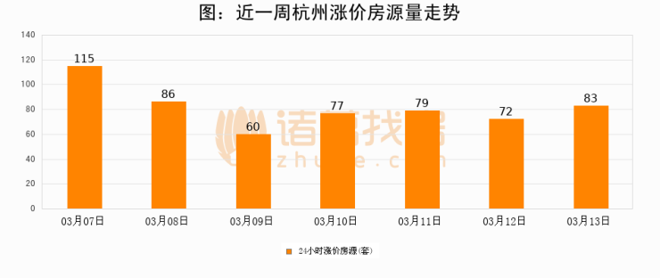 根据诸葛找房数据显示,杭州24小时涨价房源量为83套,较03月12日增加11套,环比上涨15.3%。与此同时,涨价房源占比小幅扩大,业主信心有所提升。