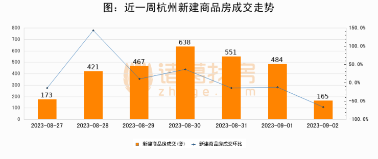 根据杭州市住房保障和房产管理局数据显示,2023年09月02日杭州新建商品房成交165套,较昨日减少319套,环比下降65.9%