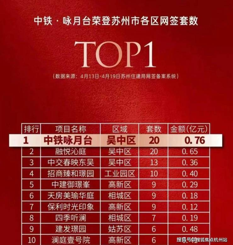 4月20日,根据苏州住建局网签备案系统数据,中铁·咏月台以单周网签20套(4.13-4.19)荣登苏州市各区网签套数TOP1!