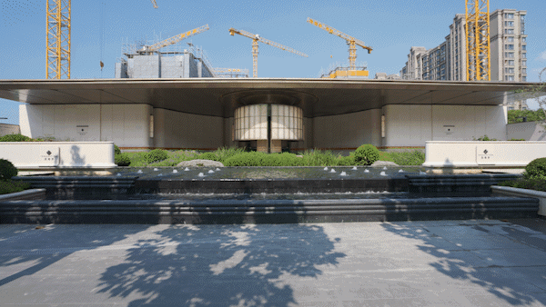 下沉式庭院,通过垂直景墙、悬浮观景台与叠水景观的立体交织,实现移步换景的视觉效果,也与会所空间形成无界交互。
