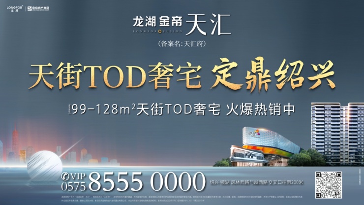 本项目推广名为“龙湖金帝·天汇”,核准地名为“天汇府”。本宣传资料为要约邀请,不构成要约内容,具体信息以书面签订的合同约定及政府最终审批为准。宣传材料中天街位置仅为参考位置示意,所示位置、距离、地图格局等均与实际有所偏差,不作为严格意义上的地图,具体以实际情况为准;外立面仅作效果示意,具体以实际为准。天街荣誉及数据来源:《东莞日报》、《搜狐号·上海虹桥》、《乐居买房》、《2020城市商业魅力排行榜》、《赢商网》、《联商网》、《搜狐焦点》、《搜狐焦点杭州》。本项目开发商为绍兴龙悦置业有限公司,本公司保留对此宣传资料修改的权利。时间:2021年07月。绍市售许字(2021)第ZJ00151号