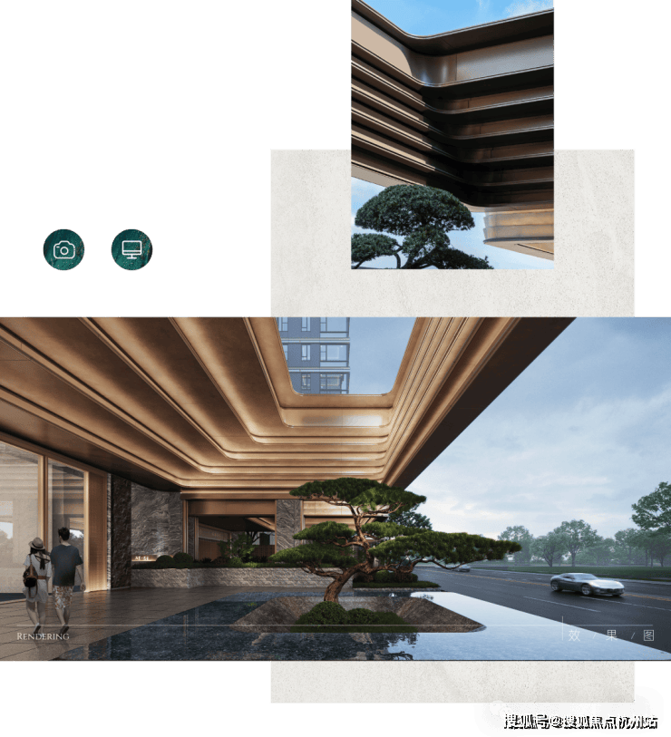 南大门以现代宋式美学为笔,库班灰石材镌凹槽光影,两侧沉稳如砚,温润玉石屏风透光藏景,轻钢飞檐承宋韵,悬挑一抹空灵。前庭孤树与奇石对望,转身水景铺陈,享影横波,归家动线于隐奢中完成由“雅境”至“松弛”的东方转场。