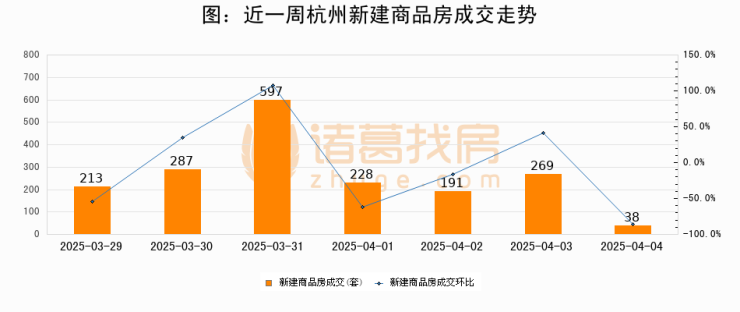 根据杭州市住房保障和房产管理局数据显示,2025年04月04日杭州新建商品房成交38套,较昨日减少231套,环比下降85.9%。近一周杭州新建商品房日均成交261套。04月04日单日成交38套,低于近一周平均水平85.4%。