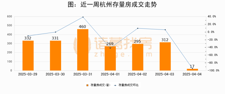 从存量房来看,2025年04月04日杭州存量房单日成交17套,比昨日减少295套,环比下降94.5%。从近一周存量房成交来看,杭州存量房日均成交套数为288套,04月04日单日成交17套,低于近一周平均水平94.1%。