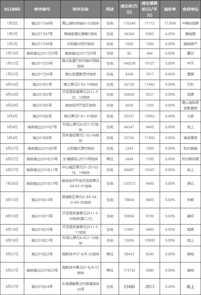 截至目前,2018年临安已经出让了23宗涉宅用地,其中一宗为租赁用地,纯宅地19宗。碧桂园、中天、万科、大家、绿地等房企都在临安布局,价格较高的是今年1月中粮和旭辉拿下的青山湖科技城地块,楼面价为11113元/㎡。在这23宗地块中,今年单价超过1万的仅7宗。