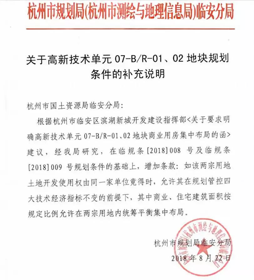 杭州市规划局临安分局在两宗地挂牌前的8月22日发布过补充说明:如22和23号两宗用地由同一家单位竞得时,允许商业、住宅建筑面积按规定比例允许在两宗用地内统筹平衡集中布局。这对于开发商对项目的整体规划设计也比较有利。