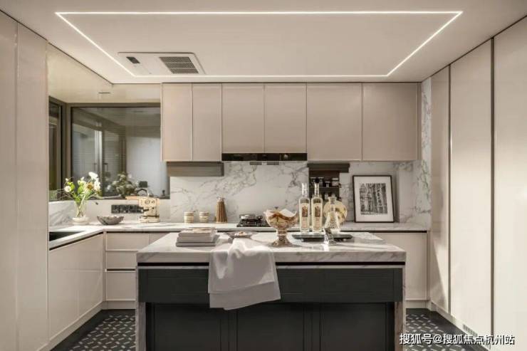 整体动静分区的格局下,U型厨房不只是烹饪场域,更因融入“社交属性”而成为家庭互动的温情角落,烹饪的同时可与客厅的家人交流。