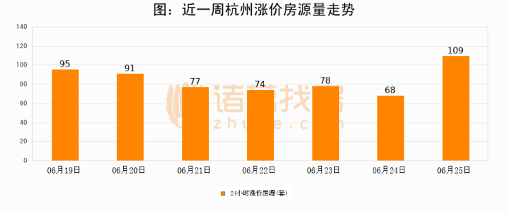根据诸葛找房数据显示,杭州24小时涨价房源量为109套,较06月24日增加41套,环比上涨60.3%。与此同时,涨价房源占比小幅扩大,业主信心有所提升。