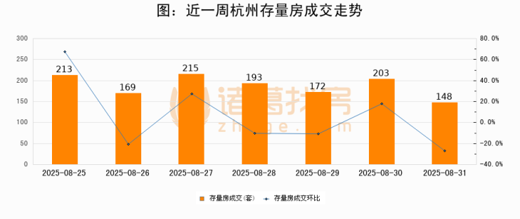 从存量房来看,2025年08月31日杭州存量房单日成交148套,比昨日减少55套,环比下降27.1%。从近一周存量房成交来看,杭州存量房日均成交套数为187套,08月31日单日成交148套,低于近一周平均水平20.9%。