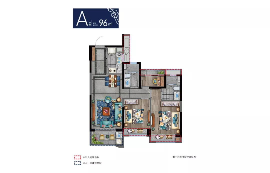 (本广告为建筑面积约96m²户型的装饰设计方案建议,仅为装修方案的效果展示,旨在提供户型空间创意示意,非开发商房屋交付标准。)