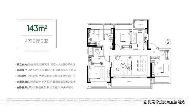 建筑面积约143平户型,则是兼具了上两个户型的功能性,既有4房设计,也有南向6.9米大横厅。主卧设计了星空浴缸和步入式衣帽间,尊崇居住体验。