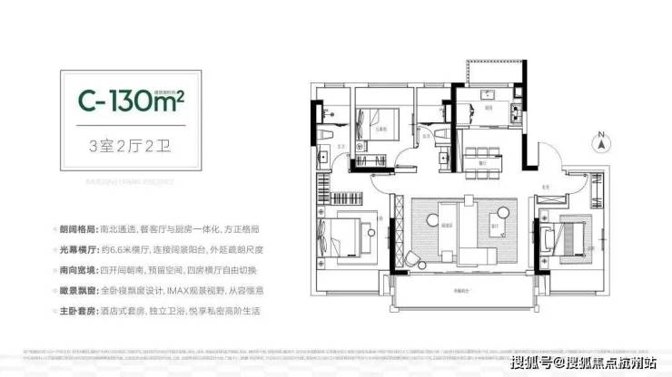 C户型则是3+1房2厅2卫的设计,南向6.6米的横厅可以自由设计,既可以是开放式书房、儿童游乐区,也可以改造为一个小卧室。