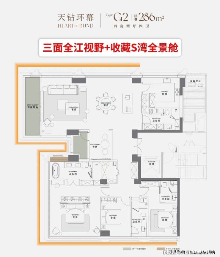 创新蝴蝶布局+真三面视野+超大全景画框+全套房设计。直面S湾,三面看江,纵享S湾全景舱360°寰视江景巨幕。真正划时代的滨江顶豪。
