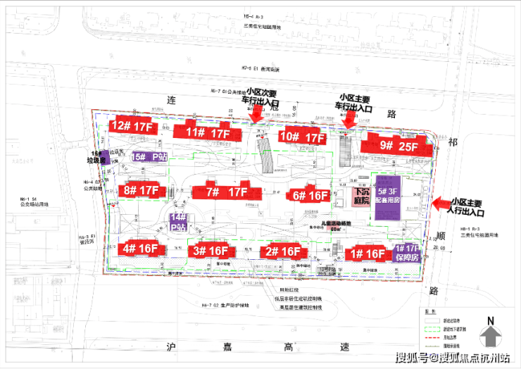 其中1号楼靠近17层的保障房,5号口为3层的配套用房;14#、15#为P站,16#为垃圾用房。