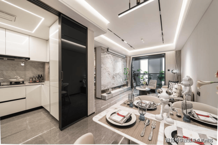 厨房空间,甄选西门子新款的抽油烟机、灶具、洗碗机等,甚至连大部分项目不配备的冰箱也是交付标准;还特别配置了轨道插座、前端净水器和凉霸;吊轨金属玻璃移门,既美观又方便清理。