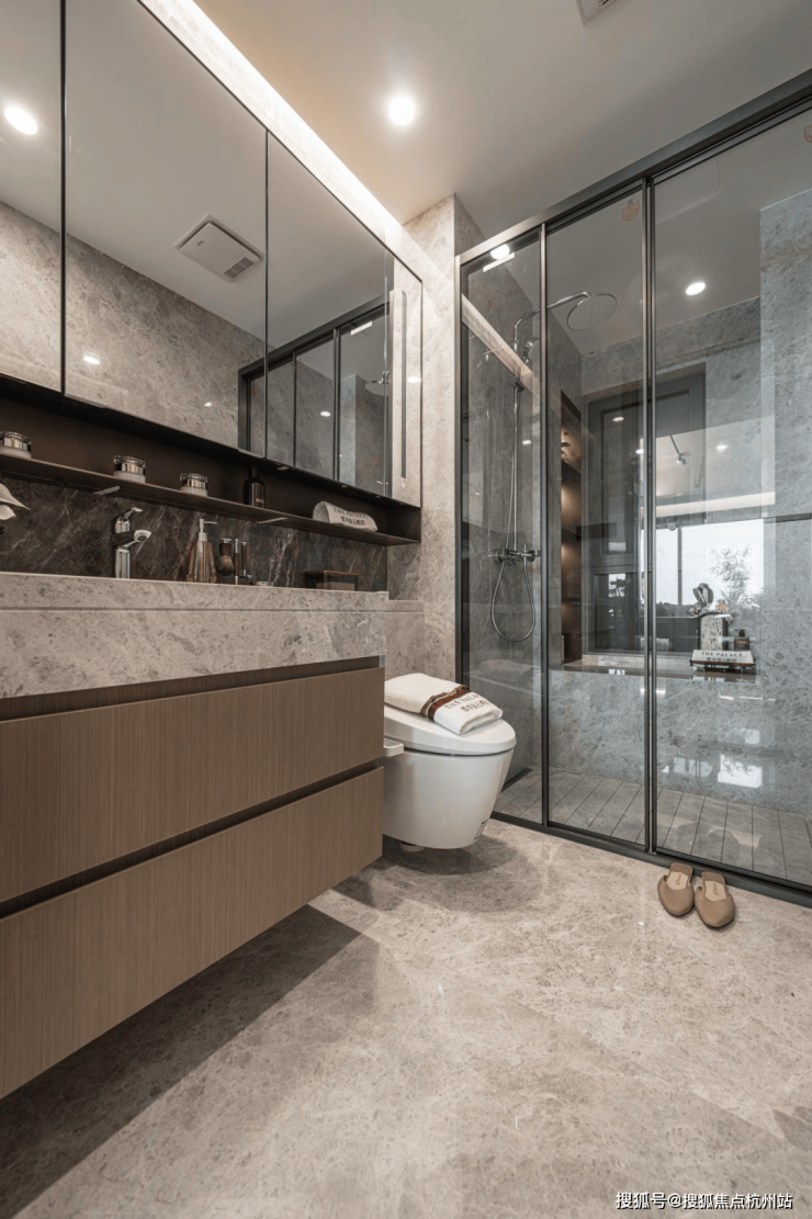 所有户型全屋墙纸交付,连电视机背景墙岩板以及主卧背景墙都是交付标准,卫生间甄选不同的石材,以此来满足功能区的需求。