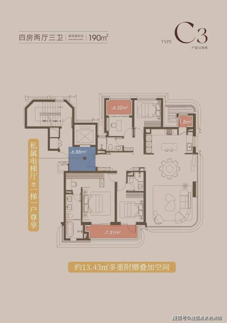 同时,这个户型拥有一个好户型应该有的所有特质:一梯一户、三阳台、主卧豪华套房、中西双厨...妥妥的终极改善产品。