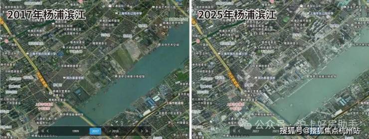 作为黄浦江畔的压轴板块,杨浦滨江的建设速度是有目共睹的,下图是2017-2025-2026年杨浦滨江的卫星影像变化图,几乎是一年一个样!