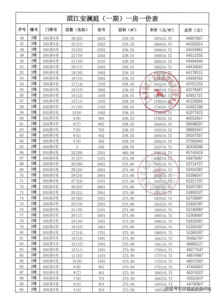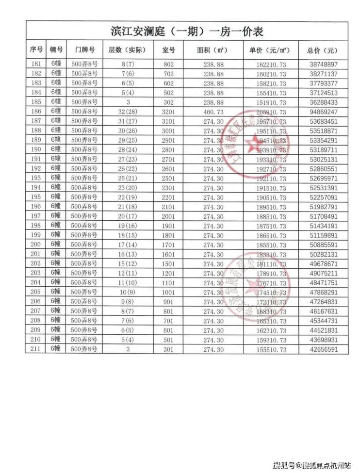 上期一房一价表如下: