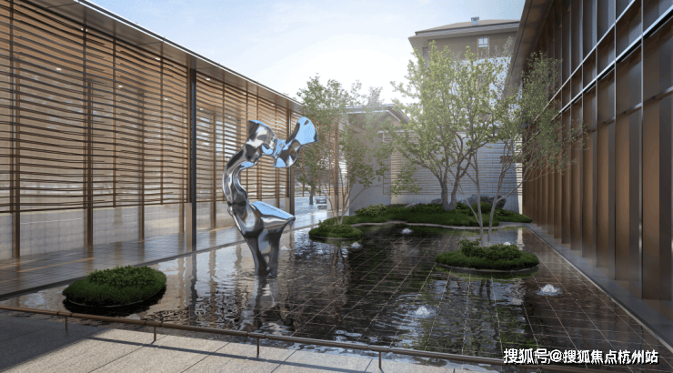 水作为贯穿兴云间整座园区最重要的元素之一,主入口处的 水景雕塑 《晓风艺墅》具有至关重要的地位,金属的光泽与水光的灵动交相辉映,成为空间中的点睛之笔。