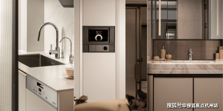 美诺四件套(燃气灶具、吸油烟机、烤箱、洗碗机)与博世冰箱联袂打造厨房艺术空间,水槽、水龙头均选用高仪,配置3M末端净水器,打造品质生活。