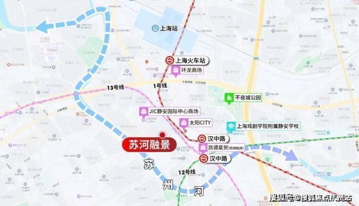 落位到具体交通,苏河融景步行可达(约200米)城心无比重要的十字交错站点——1/12/13号线汉中路站,进站后2站人民广场,2站南京西路、2站北外滩.