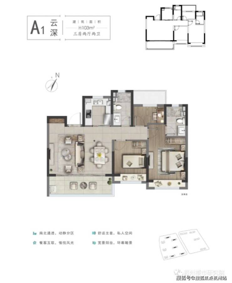 建面约103㎡,三房两厅两卫,三开间朝南,主卧套间飘窗设计。约5.4米宽厅,目前高新区客户较为偏爱小户型大横厅设计的户型
