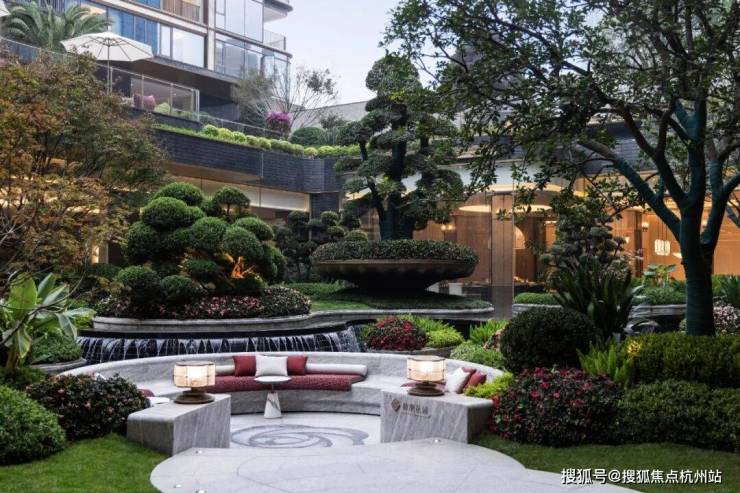 下沉式庭院:树木都是非常浓密的那种,一看就“很贵”,而且几乎每一棵都有“专属花盆”,修剪的层层叠叠。