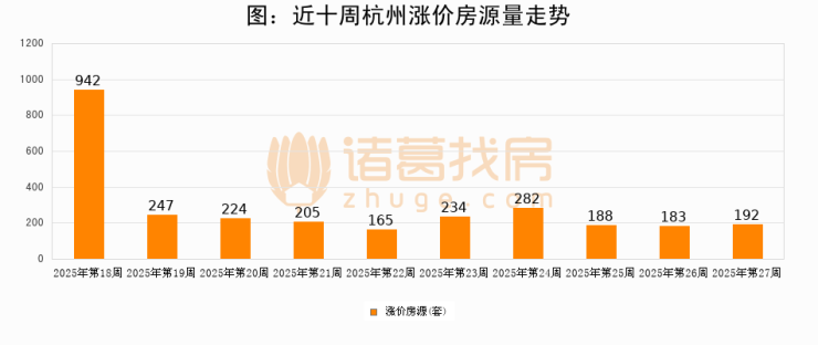 从调价房源来看,第27周杭州涨价房源192套,较上周上涨4.9%。与此同时,27周涨价房源占比提升1.76个百分点,业主信心持续恢复。