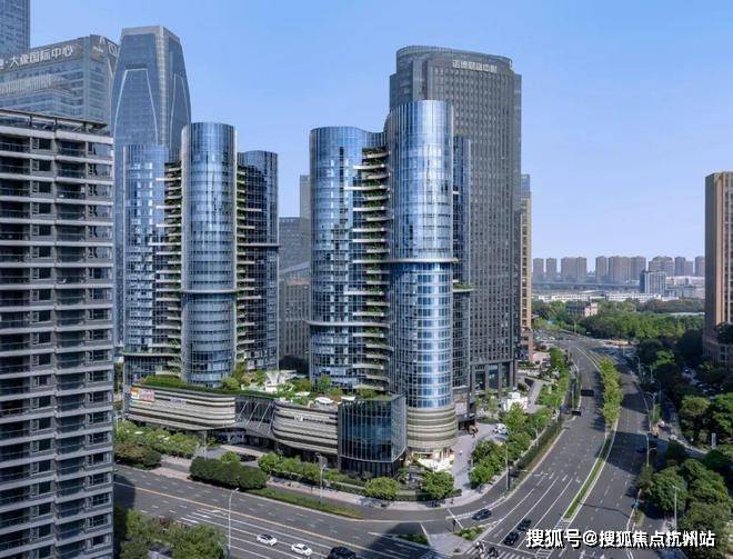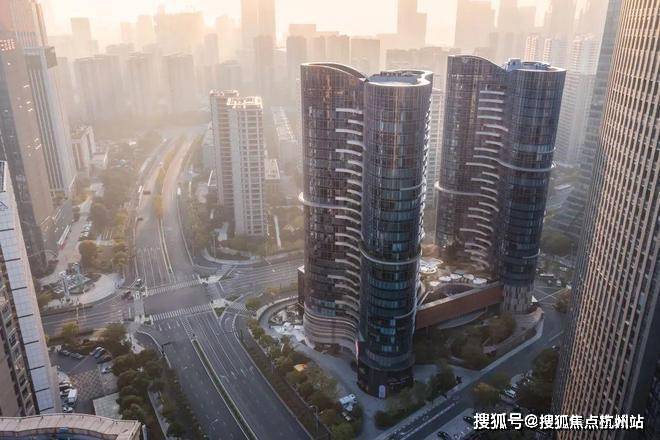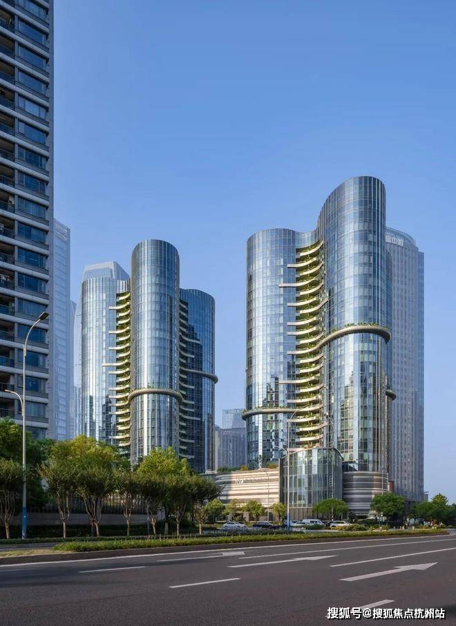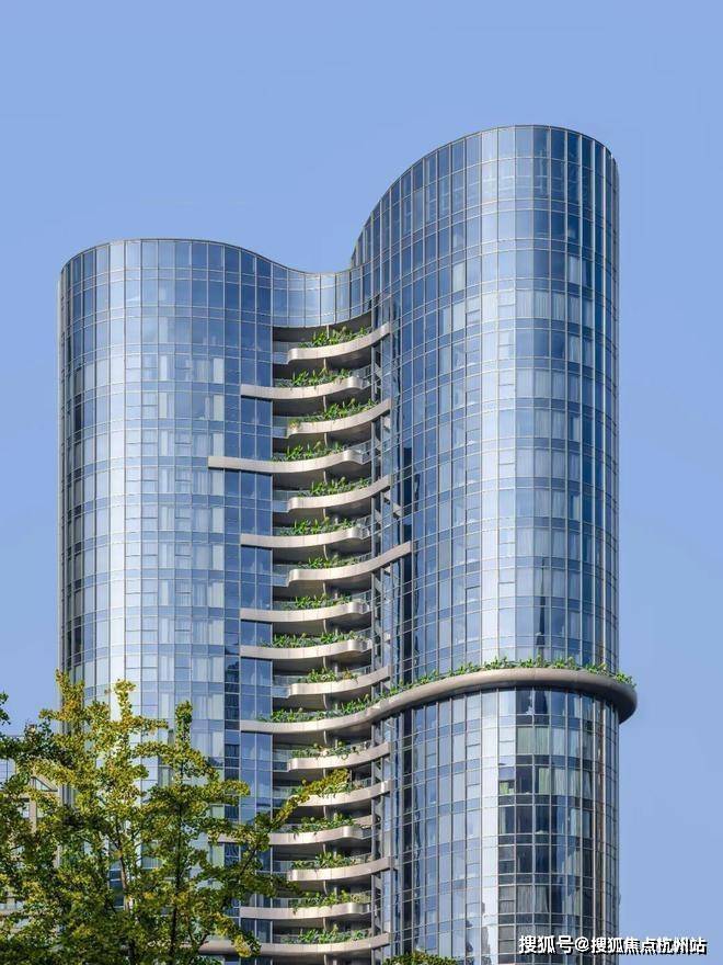 维持建筑原有结构的弧线美感,并将其由鸟瞰视角的美延续至人视可见的街景。建筑形体如两座耸立秀美的茶山,散发杭州特有的气质。山形建筑之下,裙楼屋顶被整体设计为开放式花园,使建筑、绿植、公共景观相互串联,成为隐藏在城市中的桃源绿谷,为使用者提供独特的空间体验。