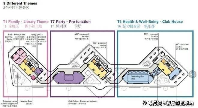 三幢公馆分别配备了不同主题配套设施,三楼顶层设有800㎡环绕阳光跑道。