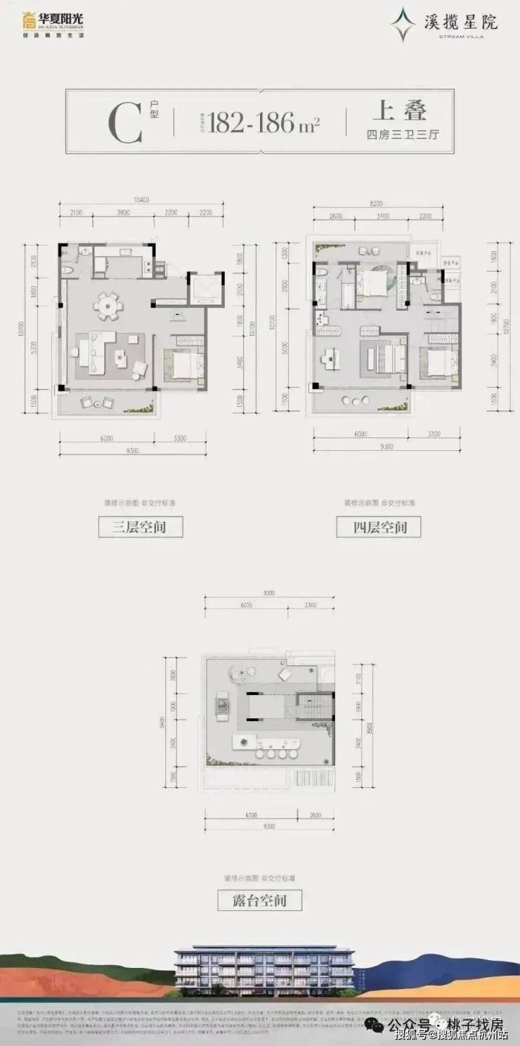 建面约182~186㎡上叠:约6m顶层观景阳台/餐客厅、书房开放设计/套房式主卧