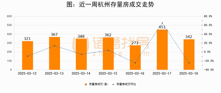 从存量房来看,2025年03月18日杭州存量房单日成交342套,比昨日减少109套,环比下降24.2%。从近一周存量房成交来看,杭州存量房日均成交套数为352套,03月18日单日成交342套,低于近一周平均水平2.8%。
