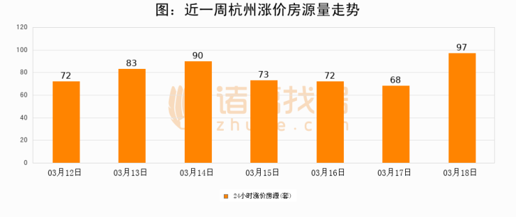 根据诸葛找房数据显示,杭州24小时涨价房源量为97套,较03月17日增加29套,环比上涨42.6%。与此同时,涨价房源占比小幅扩大,业主信心有所提升。