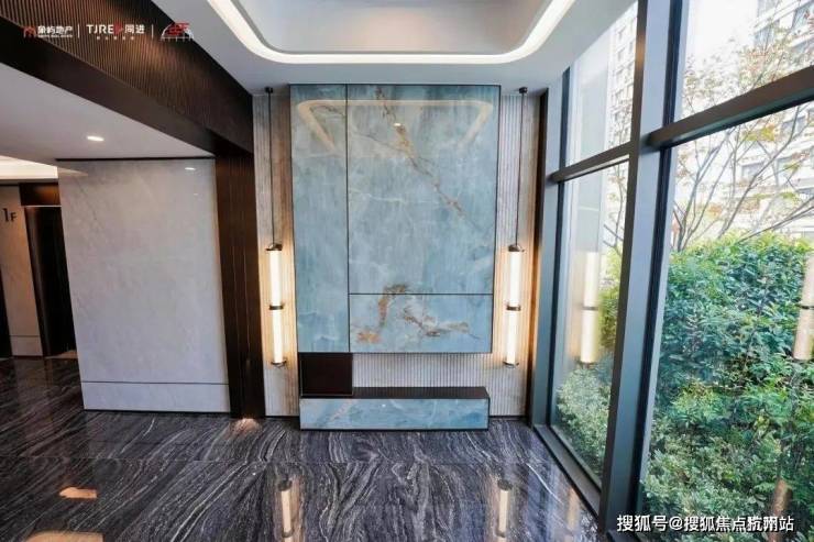 上到地上的入户空间也一样精致且方便,精筑酒店式入户大堂,与园林绿景相呼应的卡塔青玉岩板搭配鱼肚灰石材拉槽造型从感官上实现室内外空间自然过渡,云纹地砖、悬浮吊顶造型等设计丰富空间视觉效果增添恰到好处的品质感