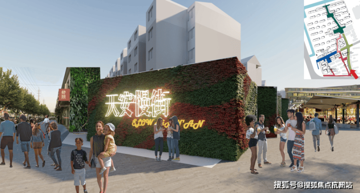 集市慢街设计:天安1号二期售楼处电话:400-998-9694 集市慢街设计,从市政漕宝路连接至养老院板块,结合艺术设计墙、灯光、休憩构建等,增加室外交流场所,提供一个商业、饮食、娱乐休闲结合的室外空间。