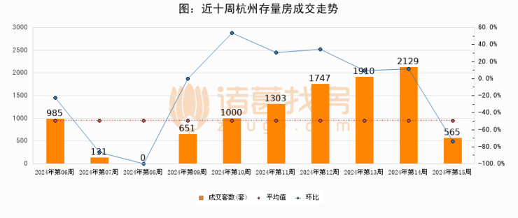 存量房方面,第14周杭州存量房成交565套,较上周减少1564套,环比下降73.5%。从近十周成交走势来看,周均成交套数为1042套,本周低于平均水平45.8%。