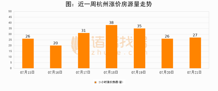 根据诸葛找房数据显示,杭州24小时涨价房源量为27套,较07月20日增加1套,环比上涨3.8%。与此同时,涨价房源占比小幅扩大,业主信心有所提升。