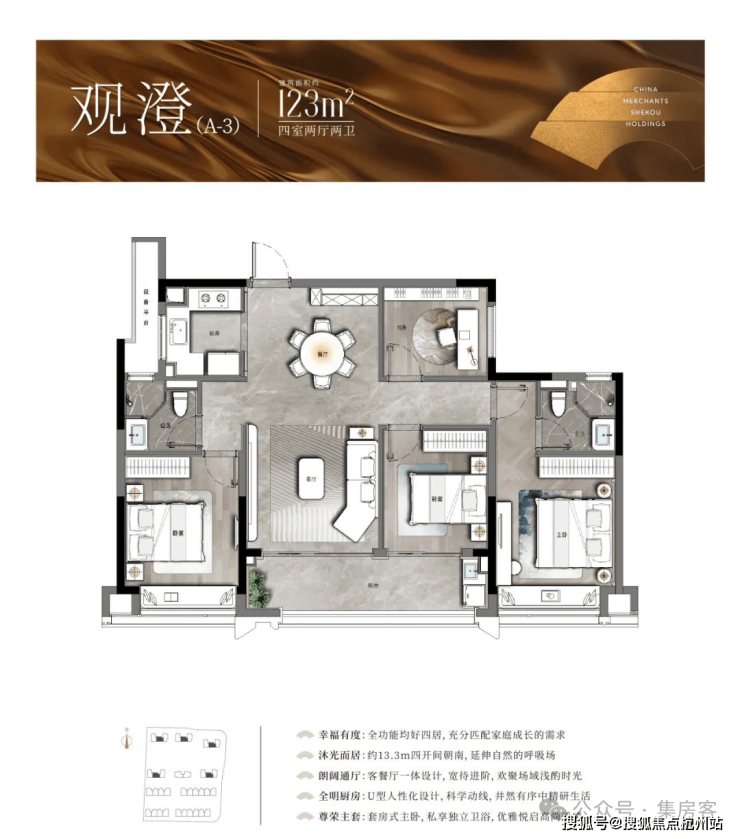 以中间套为例,建面约123㎡的户型做到了主次卧+客厅 四开间朝南,伸展开约13.3米的超大面宽 ,对应双开间阳台与飘窗的设计,进一步提升了全屋的采光。此外,一体化的餐客厅,“一镜到底”活动空间,在视觉上拉大了户型的朗阔尺度。