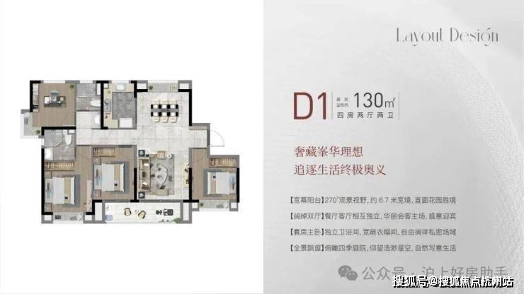 建面约130㎡4房2厅2卫,做到了四开间朝南+南北通透+主卧套房设计+双阳台设计+卫生间干湿分离,“一步到位”大4房,空间尺度非凡。