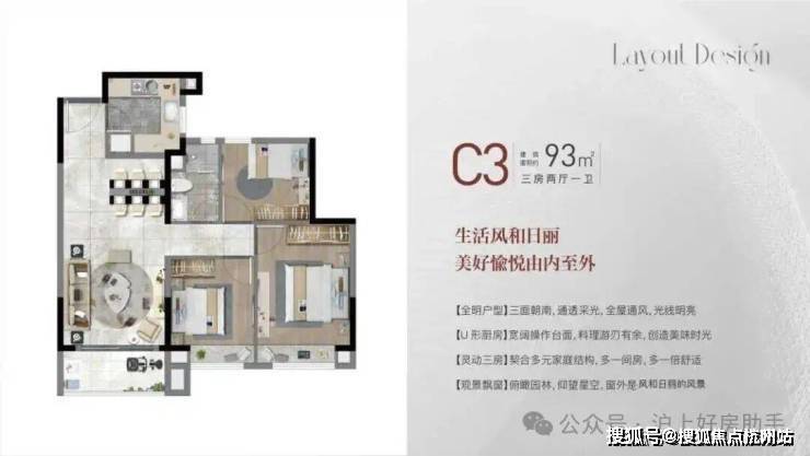 建面约93㎡3房2厅1卫,做到了三开间朝南+双卧室带飘窗+动静分离,室内通透明亮。