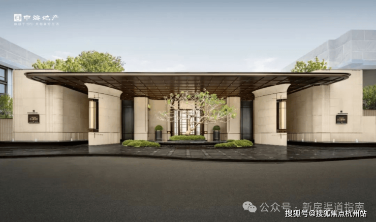 项目的主入口,门头承袭玖字理念,约55m横向尺度与约7m纵向高度,高于传统的约4m高景墙,搭配通高陈列的全石材柱体,恭迎业主归家。