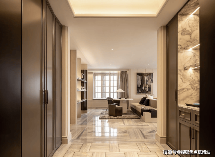 进入室内的入户玄关收纳空间,地面采用静雅棕、宝格丽兰石材拼花设计,古典回形波打+实心铜条的搭配增强入户尊贵感。右侧是山水白奢石的开放格,左侧是行李间,通过暗门的做法,将功能结合进去,强化了归家的仪式感。
