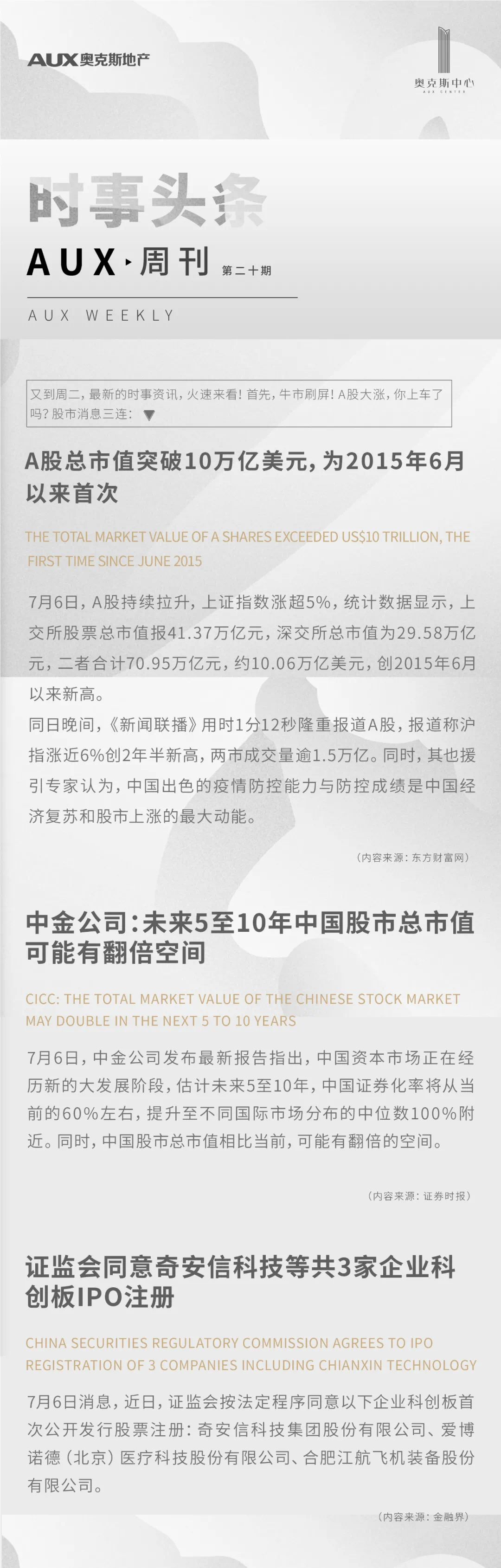 AUX周刊·时事头条XX | A股总市值突破10万亿美元,创