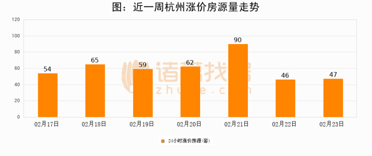 根据诸葛找房数据显示,杭州24小时涨价房源量为47套,较02月22日增加1套,环比上涨2.2%。与此同时,涨价房源占比小幅扩大,业主信心有所提升。
