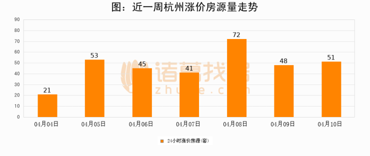 根据诸葛找房数据显示,杭州24小时涨价房源量为51套,较04月09日增加3套,环比上涨6.2%。与此同时,涨价房源占比小幅扩大,业主信心有所提升。