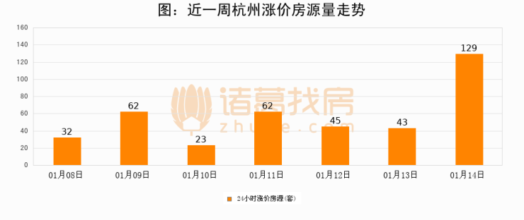 根据诸葛找房数据显示,杭州24小时涨价房源量为129套,较01月13日增加86套,环比上涨200%。与此同时,涨价房源占比小幅扩大,业主信心有所提升。